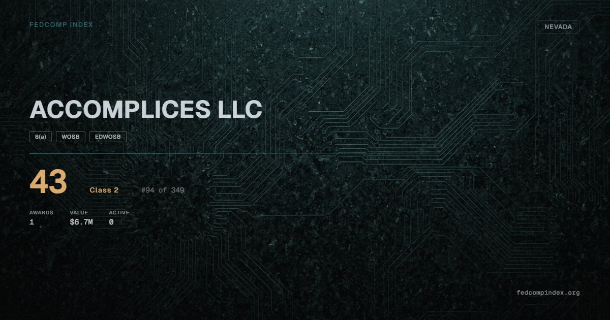 Ranked #94 among 349 Nevada federal contractors, ACCOMPLICES LLC carries a FedComp Index score of 43. Award records total $6.7M from 1 federal contracts over five years. All recorded awards come from Department of Defense. SBA-certified as 8(a), WOSB, and EDWOSB. Last recorded award dates to 2022. Top competitors by award overlap include VANGUARD INTEGRITY PROFESSIONALS INC and UNIQUE COMMUNICATIONS SOLUTIONS.