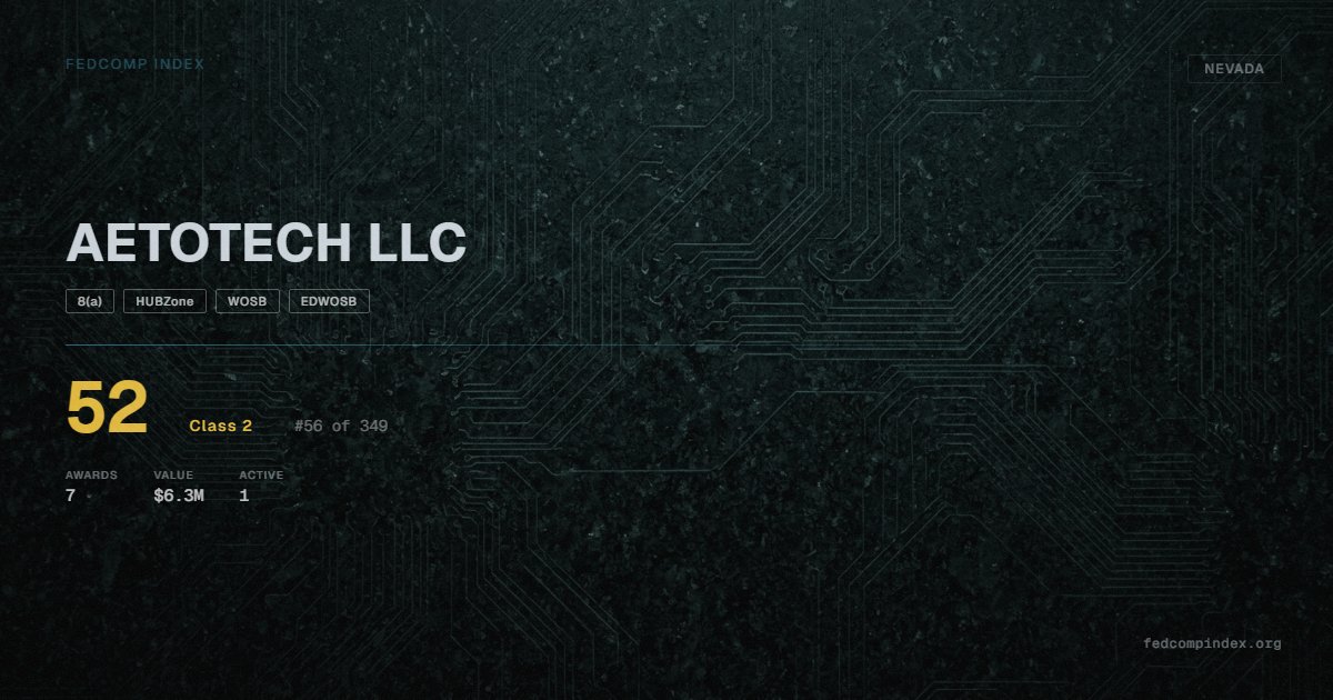 AETOTECH LLC is a Nevada-based federal contractor ranked #56 of 349 with a FedComp Index score of 52. Award records total $6.3M from 7 federal contracts over five years. All recorded awards come from Department of Defense. Holds 4 active SBA certifications: 8(a), HUBZone, WOSB, EDWOSB. One contract currently active. Last award dated July 2025. Top competitors by award overlap include CONNECTORS PLUS LLC and RX3 COMMUNICATIONS INC.