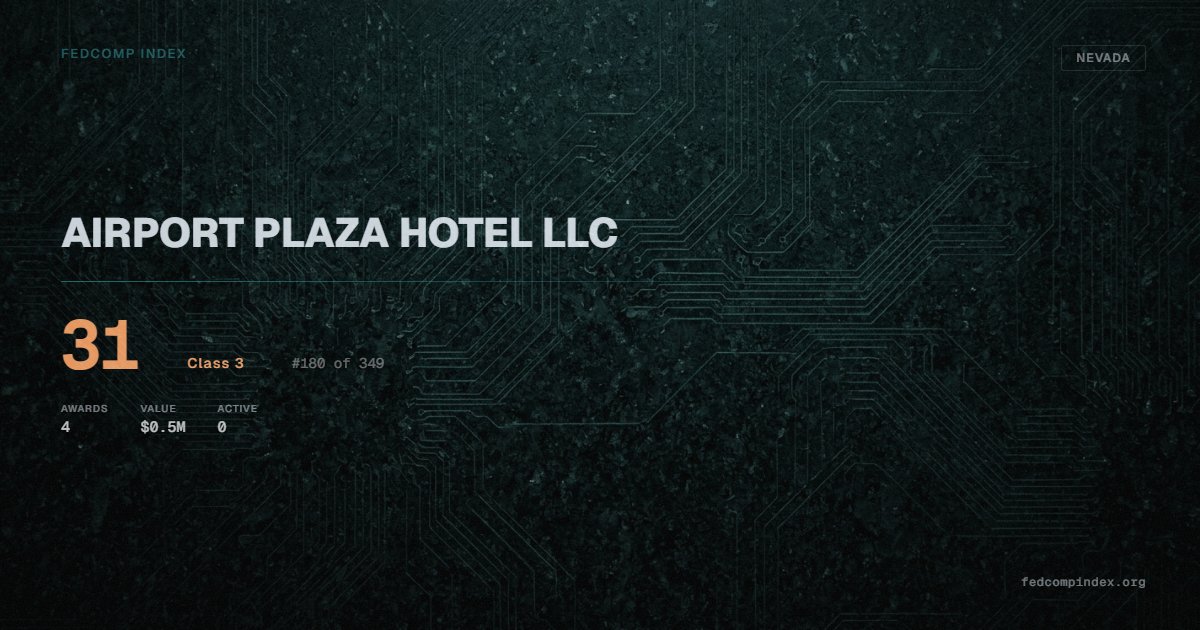 AIRPORT PLAZA HOTEL LLC holds position #180 among 349 Nevada federal contractors scored by the FedComp Index at 31. Contract records show $0.5M in federal awards over the five-year scoring window. All recorded awards come from Department of Defense. Last recorded award dates to 2024. Closest competitor by award overlap is HAWKEYE PROPERTIES LLC.