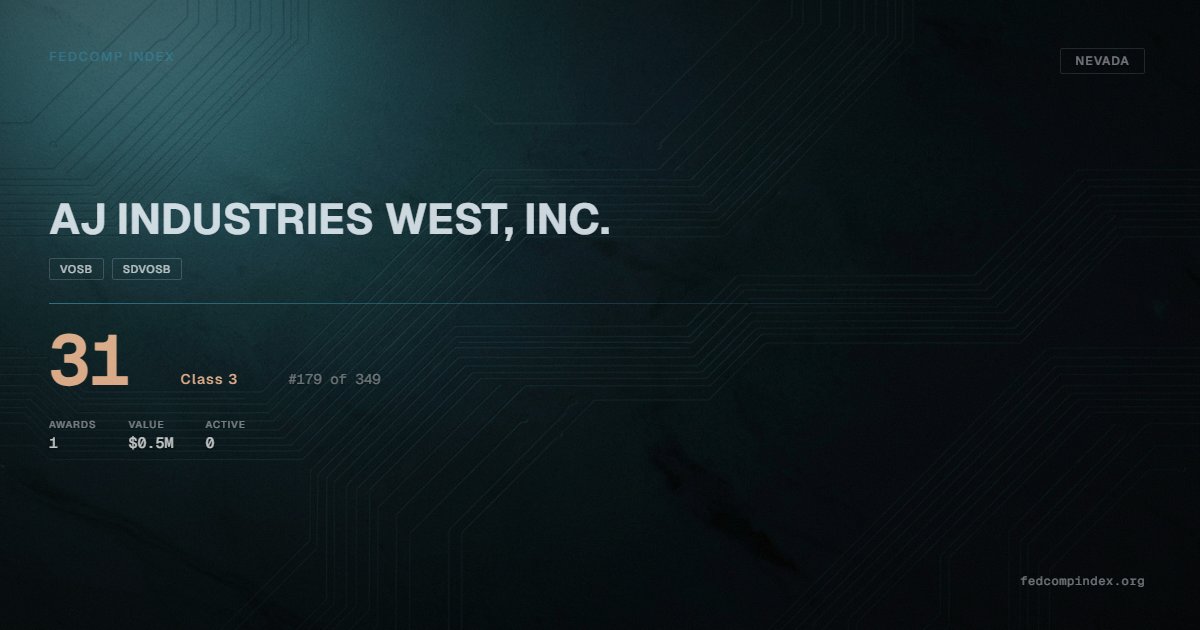 AJ INDUSTRIES WEST, INC. holds position #179 among 349 Nevada federal contractors scored by the FedComp Index at 31. Contract records show $0.5M in federal awards over the five-year scoring window. All recorded awards come from Department of Veterans Affairs. Certified as VOSB and SDVOSB through the SBA. Last recorded award dates to 2024. Top competitors by award overlap include ARRIOLA CONSULTING & INSPECTIONS LLC and SIERRA BOILER SERVICE, INC..