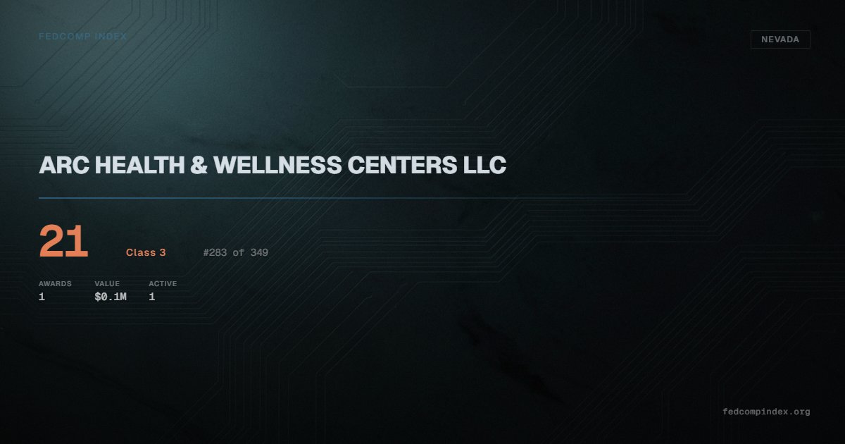 ARC HEALTH & WELLNESS CENTERS LLC holds position #283 among 349 Nevada federal contractors scored by the FedComp Index at 21. Contract records show $0.1M in federal awards over the five-year scoring window. All recorded awards come from Department of Defense. One contract currently active. Last recorded award dates to 2024. Closest competitor by award overlap is MY NEXT CAREER PATH STAFFING LLC.