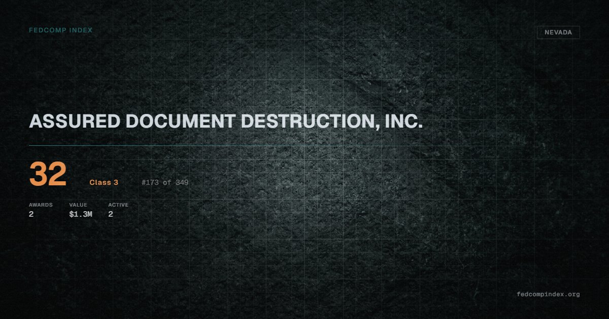 ASSURED DOCUMENT DESTRUCTION, INC. holds position #173 among 349 Nevada federal contractors scored by the FedComp Index at 32. Award records total $1.3M from 2 federal contracts over five years. Awards span Department of Defense and Social Security Administration. 2 contracts currently active. Last recorded award dates to 2023. Closest competitor by award overlap is EAGLE STAR INDUSTRIES LLC.