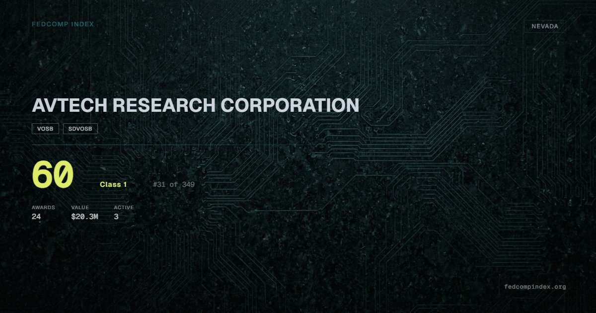 AVTECH RESEARCH CORPORATION is a Class 1 Nevada federal contractor with a FedComp Index score of 60, ranked #30 of 349. Federal contract history shows $20.3M across 24 awards in the past five years. All recorded awards come from Department of Defense. Certified as VOSB and SDVOSB through the SBA. 3 contracts currently active. Last award dated October 2025. Top competitors by award overlap include EDL CONSTRUCTION INC and BOTACH INC..