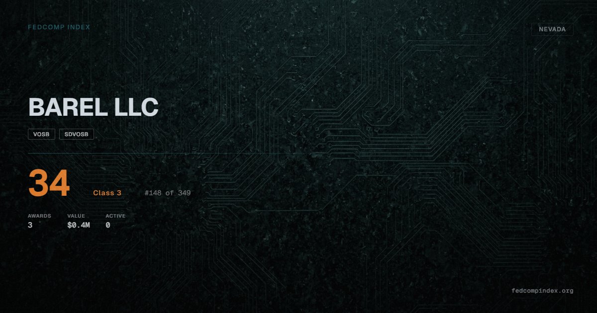 BAREL LLC holds position #149 among 349 Nevada federal contractors scored by the FedComp Index at 34. Contract records show $0.4M in federal awards over the five-year scoring window. All recorded awards come from Department of Defense. Certified as VOSB and SDVOSB through the SBA. Last award dated September 2025. Top competitors by award overlap include SVI INC and VES CO, INC.