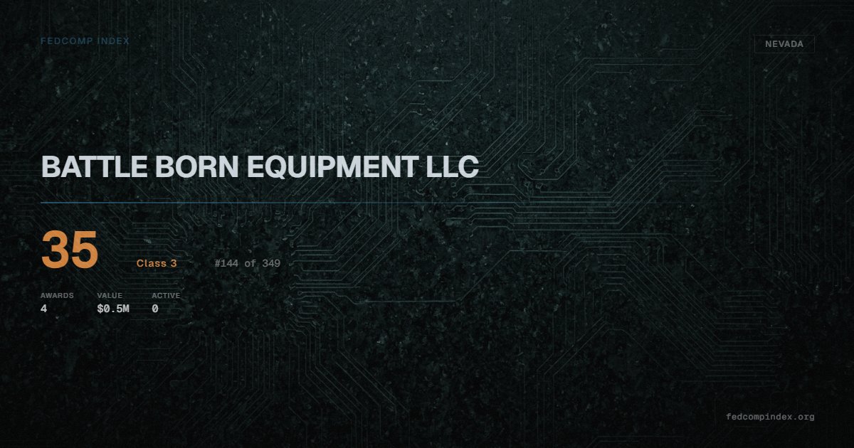 BATTLE BORN EQUIPMENT LLC holds position #145 among 349 Nevada federal contractors scored by the FedComp Index at 35. Contract records show $0.5M in federal awards over the five-year scoring window. All recorded awards come from Department of Agriculture. Last award dated July 2025. Top competitors by award overlap include HYDROTACTICAL INC and KKS WATER SERVICE INC.