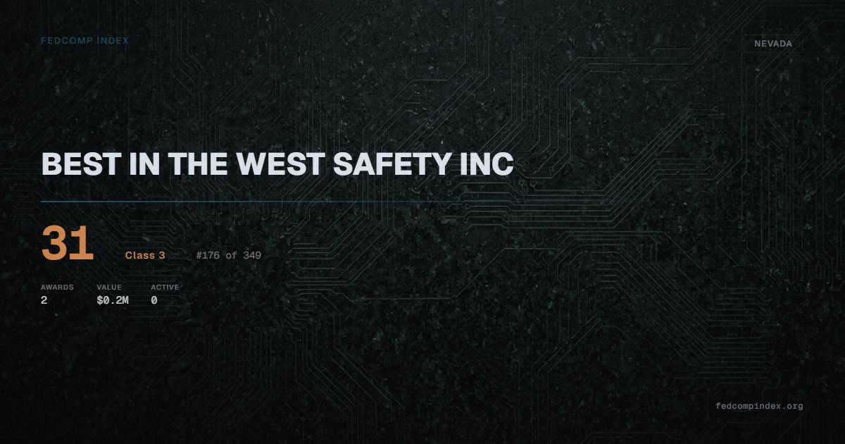 BEST IN THE WEST SAFETY INC holds position #176 among 349 Nevada federal contractors scored by the FedComp Index at 31. Contract records show $0.2M in federal awards over the five-year scoring window. All recorded awards come from Department of Defense. Last award dated September 2025. Top competitors by award overlap include BARBEE VALVE & SUPPLY INC and SIERRA PACIFIC INNOVATIONS, CORP..