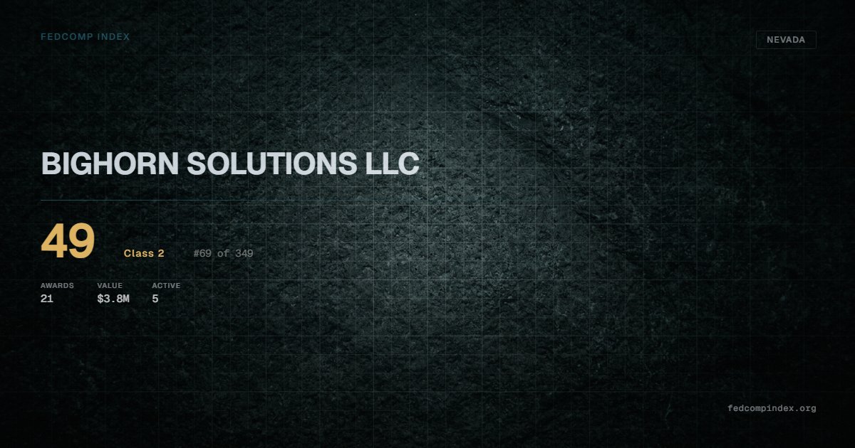 BIGHORN SOLUTIONS LLC is a Nevada-based federal contractor ranked #69 of 349 with a FedComp Index score of 49. Award records total $3.8M from 21 federal contracts over five years. All recorded awards come from Department of Defense. Has 5 active contracts on record. Last award dated November 2025. Top competitors by award overlap include CONNECTORS PLUS LLC and POWERJET PARTS INC.