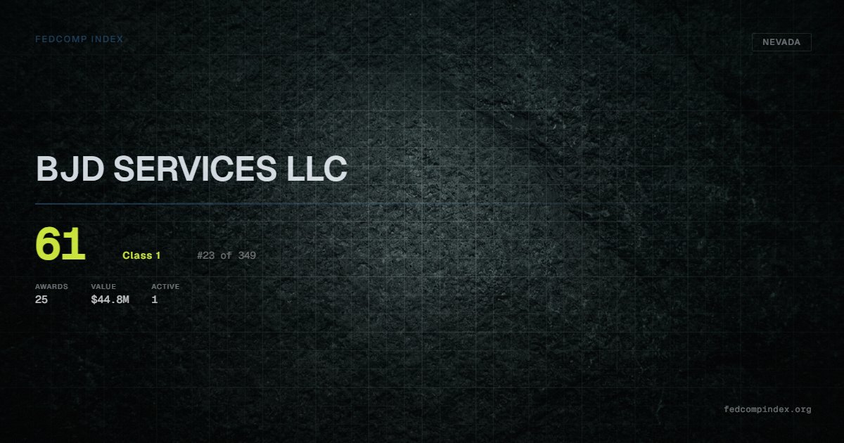 BJD SERVICES LLC is a Class 1 Nevada federal contractor with a FedComp Index score of 61, ranked #23 of 349. Federal contract history shows $44.8M across 25 awards in the past five years. All recorded awards come from Department of Defense. One contract currently active. Most recent contract activity from early 2025. Top competitors by award overlap include SENTINEL BUILDERS, LLC and MILLER ELECTRIC COMPANY INC..