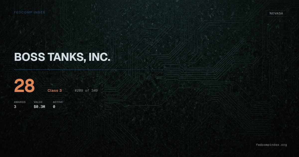 BOSS TANKS, INC. holds position #209 among 349 Nevada federal contractors scored by the FedComp Index at 28. Contract records show $0.3M in federal awards over the five-year scoring window. Awards span Department of Agriculture and Department of the Interior. Most recent contract activity from early 2025. Top competitors by award overlap include OMG SOURCING LLC and ECOSERV WEST, INC.