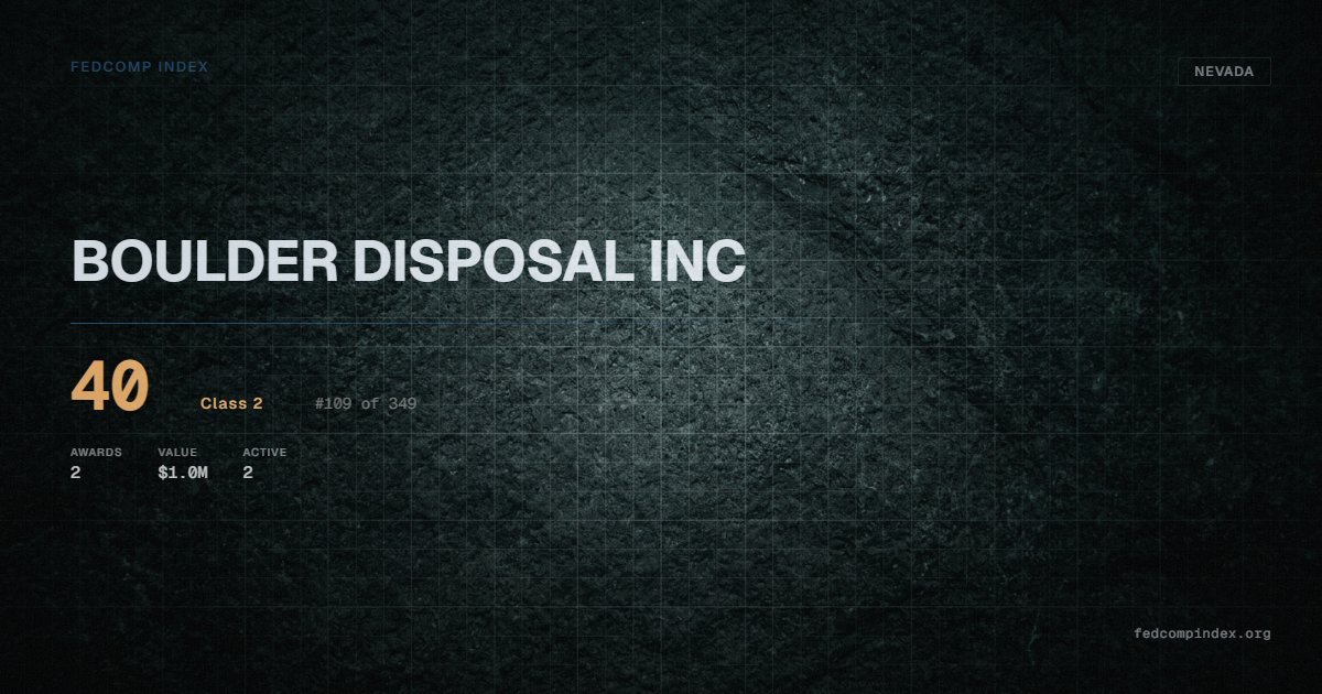 Ranked #109 among 349 Nevada federal contractors, BOULDER DISPOSAL INC carries a FedComp Index score of 40. Award records total $1.0M from 2 federal contracts over five years. All recorded awards come from Department of the Interior. 2 contracts currently active. Most recent award recorded in February 2026. Closest competitor by award overlap is ELY DISPOSAL SERVICE INC.