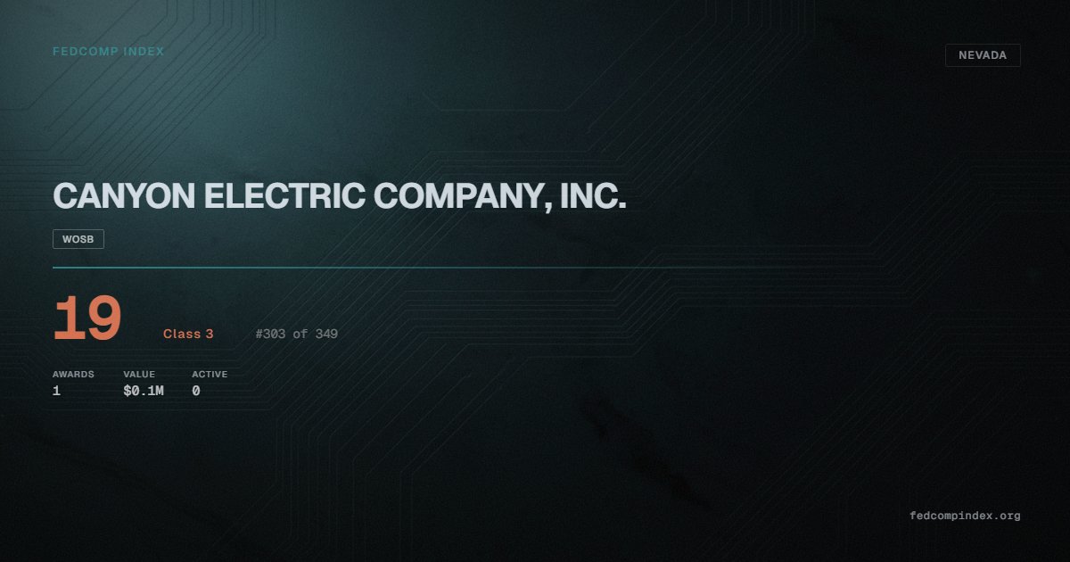 CANYON ELECTRIC COMPANY, INC. holds position #303 among 349 Nevada federal contractors scored by the FedComp Index at 19. Contract records show $0.1M in federal awards over the five-year scoring window. All recorded awards come from Department of the Interior. Carries an active WOSB certification. Last recorded award dates to 2023. Top competitors by award overlap include KOR BUILDING GROUP LLC and D&G FACILITY SOLUTIONS LLC.