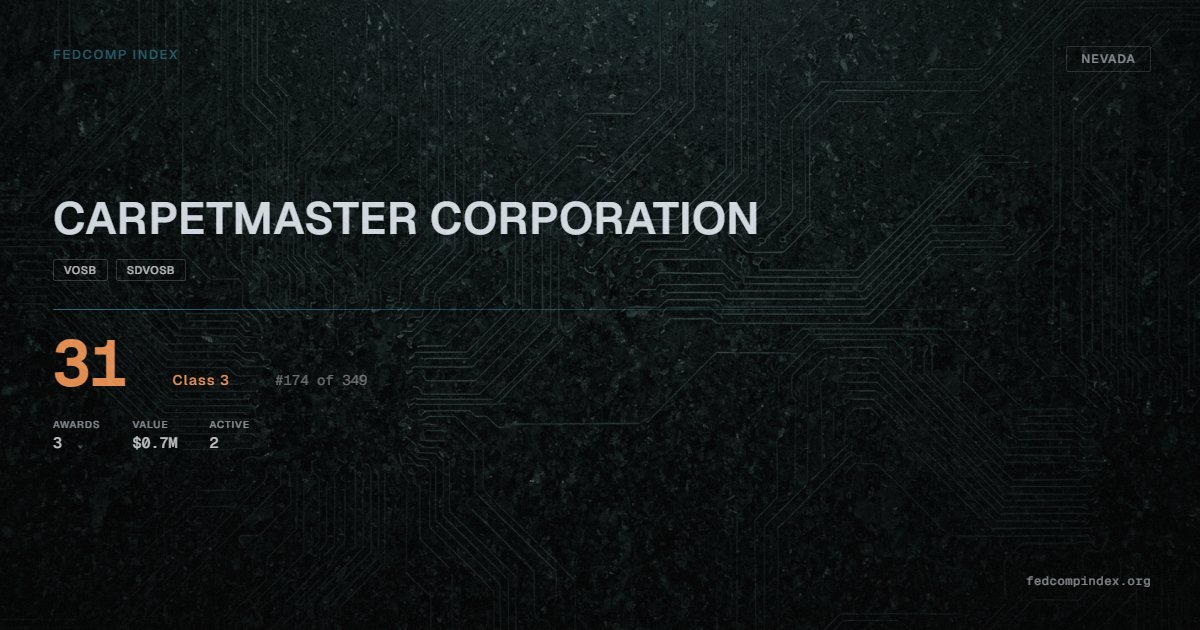 CARPETMASTER CORPORATION holds position #174 among 349 Nevada federal contractors scored by the FedComp Index at 31. Contract records show $0.7M in federal awards over the five-year scoring window. All recorded awards come from Department of Veterans Affairs. Certified as VOSB and SDVOSB through the SBA. 2 contracts currently active. Last recorded award dates to 2023. Top competitors by award overlap include EAGLE STAR INDUSTRIES LLC and WASHOE ABILITY RESOURCE CENTER.