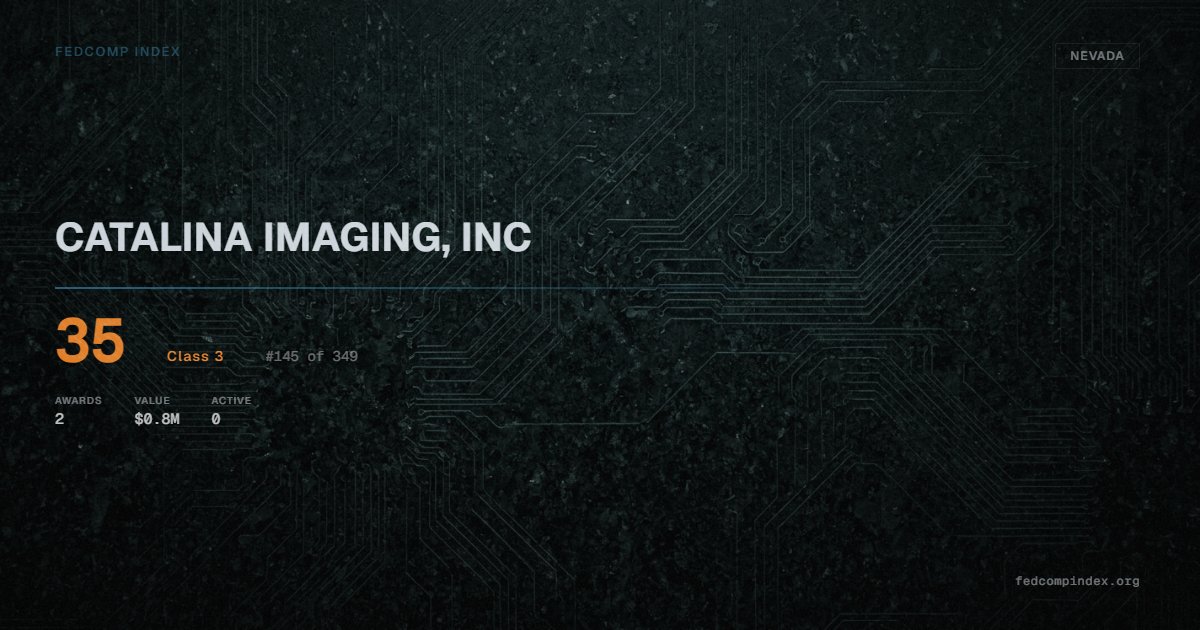 CATALINA IMAGING, INC holds position #146 among 349 Nevada federal contractors scored by the FedComp Index at 35. Contract records show $0.8M in federal awards over the five-year scoring window. Awards span Department of Defense and Department of Veterans Affairs. Most recent contract activity from early 2025. Top competitors by award overlap include BRIGADE MEDICAL SERVICES INC and MARVEL WATER LLC.