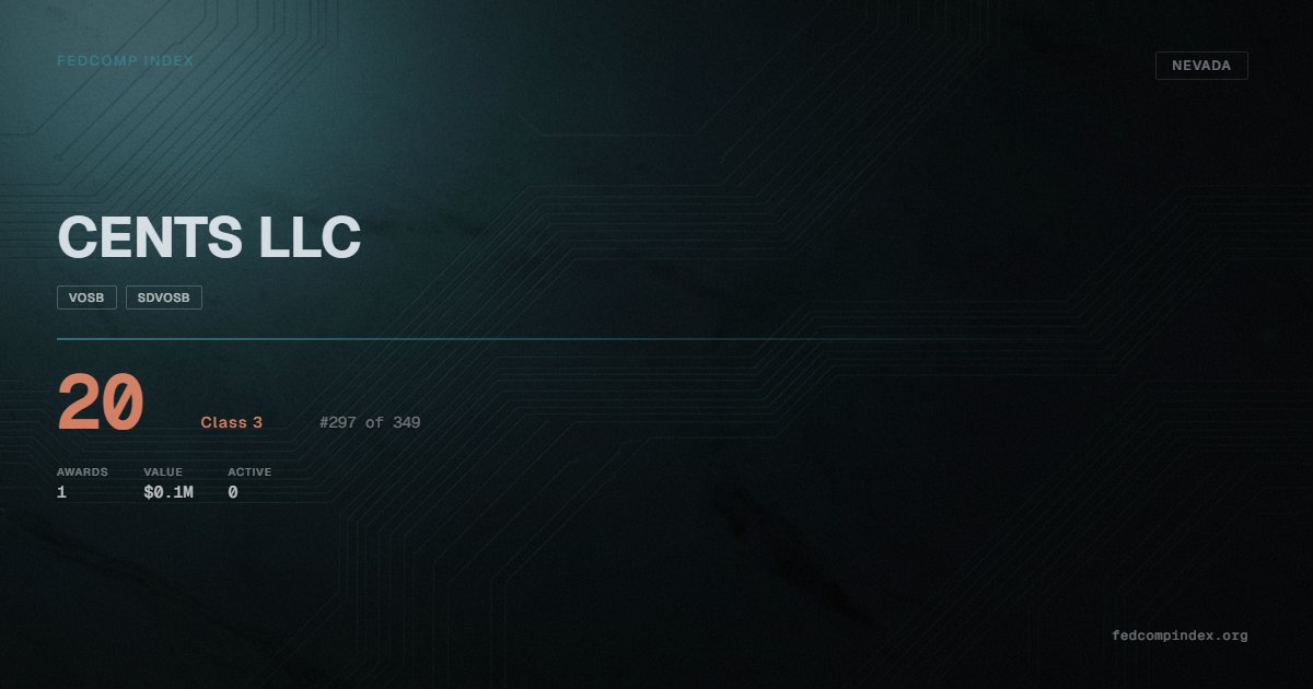 CENTS LLC holds position #297 among 349 Nevada federal contractors scored by the FedComp Index at 20. Contract records show $0.1M in federal awards over the five-year scoring window. All recorded awards come from Department of Homeland Security. Certified as VOSB and SDVOSB through the SBA. Last recorded award dates to 2024. Top competitors by award overlap include PROTECTION TECHNOLOGIES, INC. and BOTACH INC..