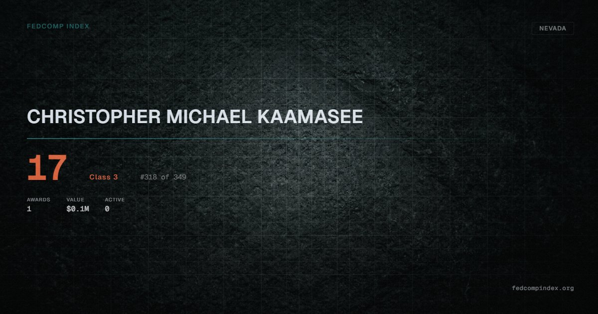 CHRISTOPHER MICHAEL KAAMASEE holds position #318 among 349 Nevada federal contractors scored by the FedComp Index at 17. Contract records show $0.1M in federal awards over the five-year scoring window. All recorded awards come from Department of the Interior. Last recorded award dates to 2022. Top competitors by award overlap include G BAR L, LLC and GOMEZ TRANSPORT LLC.