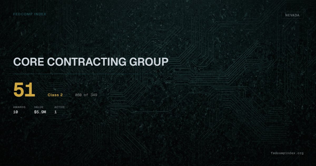 CORE CONTRACTING GROUP is a Nevada-based federal contractor ranked #60 of 349 with a FedComp Index score of 51. Award records total $5.9M from 10 federal contracts over five years. All recorded awards come from Department of the Interior. One contract currently active. Most recent award recorded in February 2026. Top competitors by award overlap include CATE LAND INDUSTRIES and CUTTING EDGE CONTRACTORS INC.