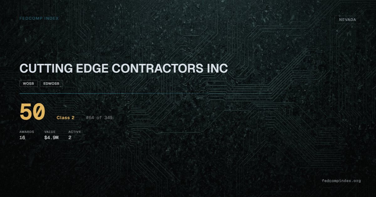 CUTTING EDGE CONTRACTORS INC is a Nevada-based federal contractor ranked #64 of 349 with a FedComp Index score of 50. Award records total $4.9M from 16 federal contracts over five years. Awards span Department of Agriculture and Department of the Interior. Certified as WOSB and EDWOSB through the SBA. 2 contracts currently active. Last award dated September 2025. Top competitors by award overlap include CORE CONTRACTING GROUP and L & I FENCE CONSTRUCTION INC.