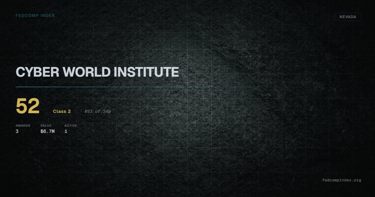 CYBER WORLD INSTITUTE is a Nevada-based federal contractor ranked #53 of 349 with a FedComp Index score of 52. Award records total $6.7M from 3 federal contracts over five years. Awards span Department of Homeland Security and Department of Justice. One contract currently active. Last award dated August 2025. Top competitors by award overlap include OREADY LLC and ALL IN AVIATION LLC.