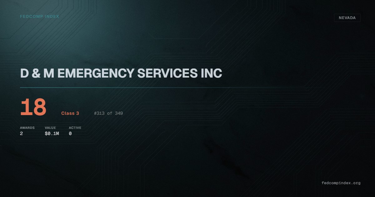 D & M EMERGENCY SERVICES INC holds position #313 among 349 Nevada federal contractors scored by the FedComp Index at 18. Contract records show $0.1M in federal awards over the five-year scoring window. All recorded awards come from Department of Agriculture. Last recorded award dates to 2021. Top competitors by award overlap include SPENCER MOTORWORKS, LLC and JBP LLC.