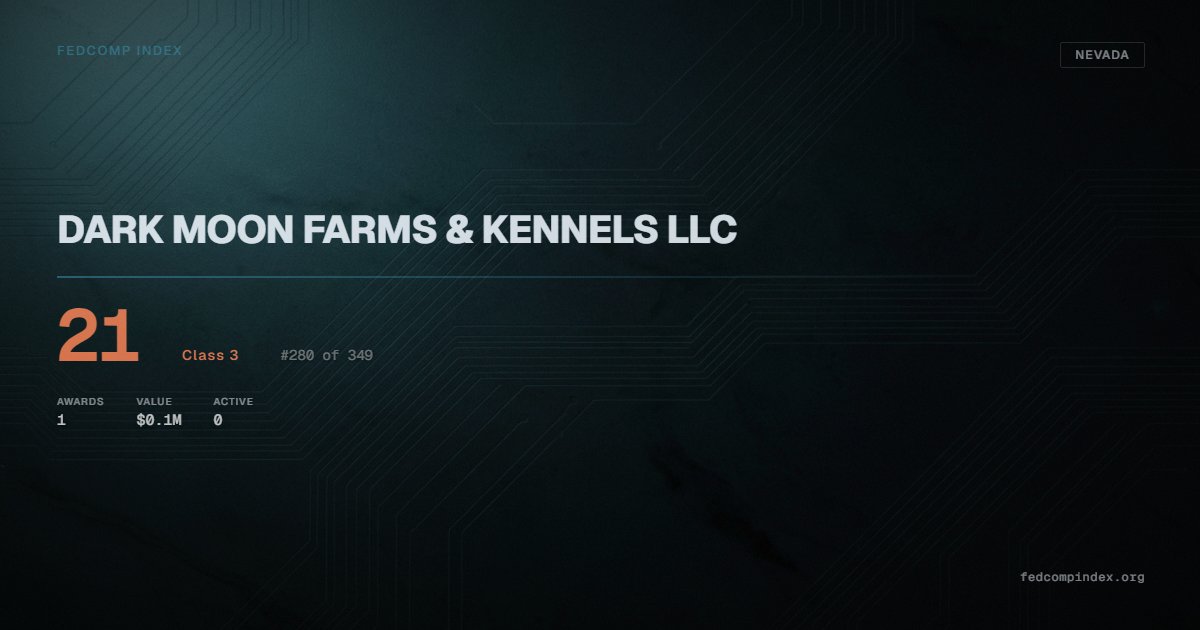 DARK MOON FARMS & KENNELS LLC holds position #280 among 349 Nevada federal contractors scored by the FedComp Index at 21. Contract records show $0.1M in federal awards over the five-year scoring window. All recorded awards come from Department of Homeland Security. Last recorded award dates to 2024.