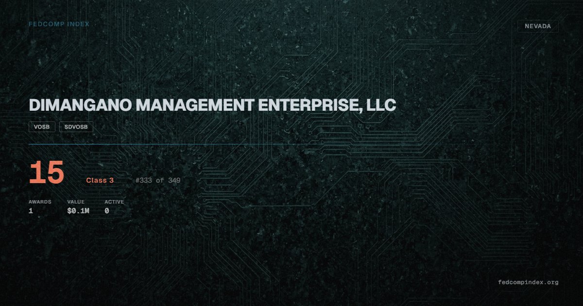 DIMANGANO MANAGEMENT ENTERPRISE, LLC holds position #333 among 349 Nevada federal contractors scored by the FedComp Index at 15. Contract records show $0.1M in federal awards over the five-year scoring window. All recorded awards come from Department of Veterans Affairs. Certified as VOSB and SDVOSB through the SBA. Last recorded award dates to 2021.