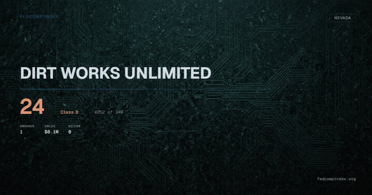 DIRT WORKS UNLIMITED holds position #252 among 349 Nevada federal contractors scored by the FedComp Index at 24. Contract records show $0.1M in federal awards over the five-year scoring window. All recorded awards come from Department of Agriculture. Most recent contract activity from early 2025. Top competitors by award overlap include GOMEZ TRANSPORT LLC and CRIDDLE CONTRACTING, LLC.