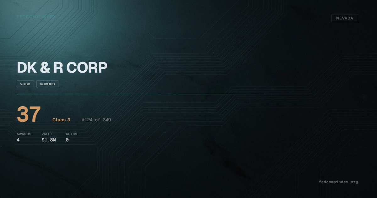 DK & R CORP holds position #124 among 349 Nevada federal contractors scored by the FedComp Index at 37. Award records total $1.8M from 4 federal contracts over five years. Awards span Department of Defense and Department of Veterans Affairs. Certified as VOSB and SDVOSB through the SBA. Last recorded award dates to 2024. Top competitors by award overlap include PROTECTION TECHNOLOGIES, INC. and BOTACH INC..