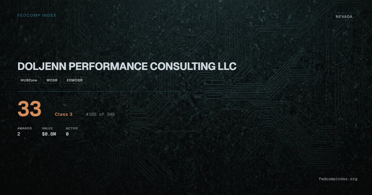 DOLJENN PERFORMANCE CONSULTING LLC holds position #165 among 349 Nevada federal contractors scored by the FedComp Index at 33. Contract records show $0.6M in federal awards over the five-year scoring window. Awards span Department of Defense and Department of Health and Human Services. SBA-certified as HUBZone, WOSB, and EDWOSB. Last recorded award dates to 2024. Top competitors by award overlap include OPTIMUMEDICINE LLC and QUANTUM MARK, LLC.