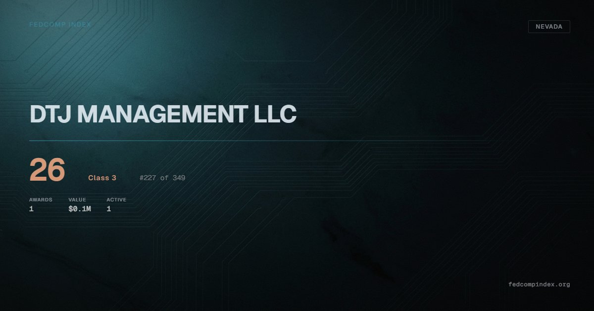 DTJ MANAGEMENT LLC holds position #227 among 349 Nevada federal contractors scored by the FedComp Index at 26. Contract records show $0.1M in federal awards over the five-year scoring window. All recorded awards come from Department of Defense. One contract currently active. Last award dated September 2025. Top competitors by award overlap include LINDA L. CLEMENTS & JOHN L. CROWLEY and REDWOOD MATERIALS INC.
