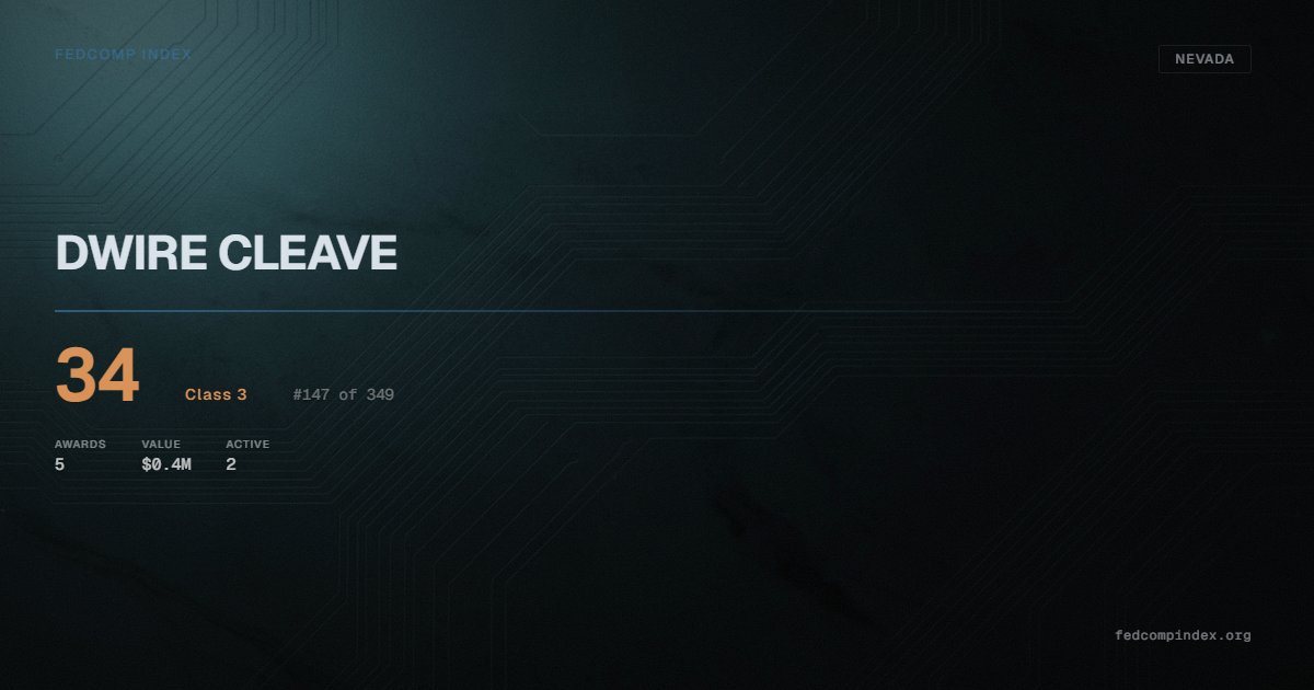 DWIRE CLEAVE holds position #148 among 349 Nevada federal contractors scored by the FedComp Index at 34. Contract records show $0.4M in federal awards over the five-year scoring window. All recorded awards come from Department of the Interior. 2 contracts currently active. Last award dated July 2025. Top competitors by award overlap include UHALDE LIVESTOCK LLC and 3-4-5 RANCH INC.