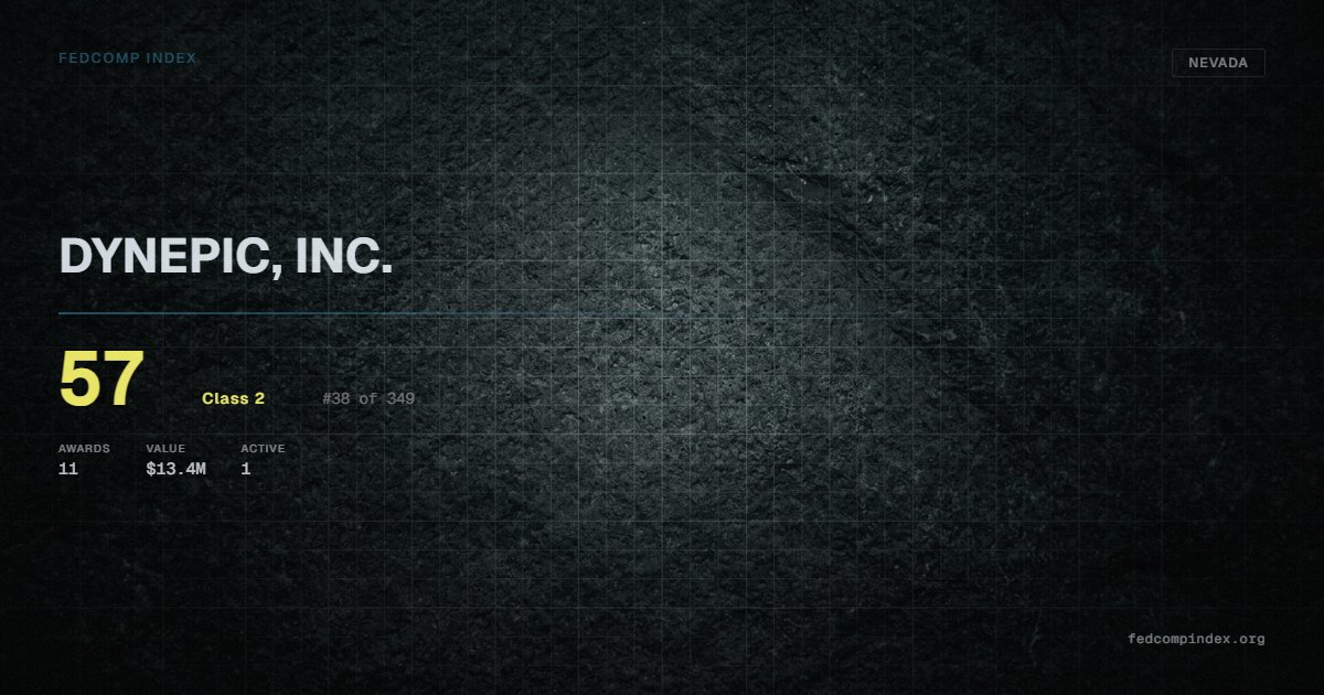 DYNEPIC, INC. is a Nevada-based federal contractor ranked #38 of 349 with a FedComp Index score of 57. Federal contract history shows $13.4M across 11 awards in the past five years. All recorded awards come from Department of Defense. One contract currently active. Most recent contract activity from early 2025. Top competitors by award overlap include VANGUARD INTEGRITY PROFESSIONALS INC and DARE VENTURE GROUP LLC.