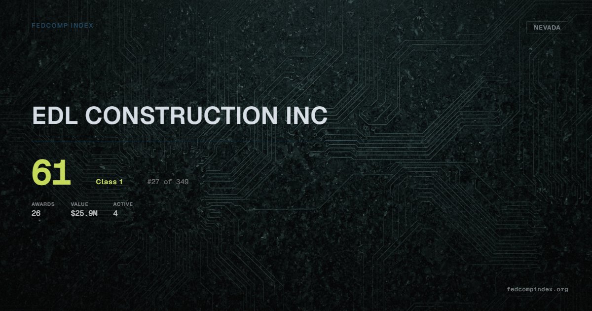 EDL CONSTRUCTION INC is a Class 1 Nevada federal contractor with a FedComp Index score of 61, ranked #27 of 349. Federal contract history shows $25.9M across 26 awards in the past five years. Awards span Department of Defense and Department of the Interior. 4 contracts currently active. Last award dated September 2025. Top competitors by award overlap include AVTECH RESEARCH CORPORATION and LIRA ELECTRIC, LLC.