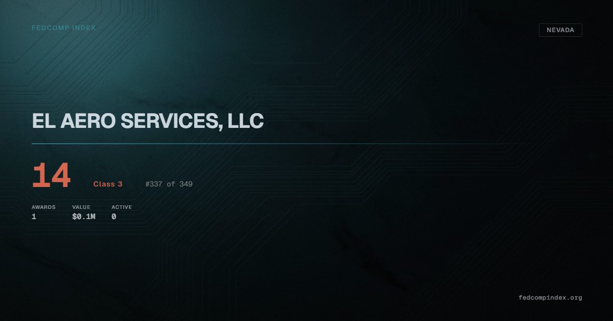 EL AERO SERVICES, LLC holds position #337 among 349 Nevada federal contractors scored by the FedComp Index at 14. Contract records show $0.1M in federal awards over the five-year scoring window. Awards span Department of Agriculture and Department of the Interior. Last recorded award dates to 2021. Closest competitor by award overlap is SKYDANCE HELICOPTERS OF NORTHERN NEVADA.