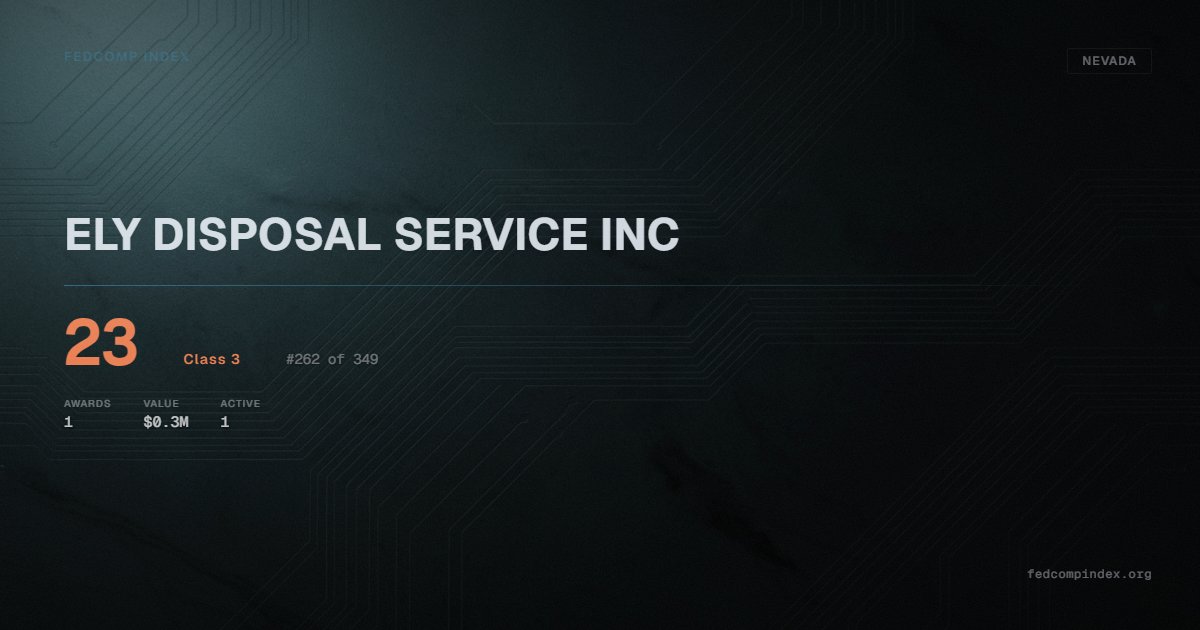 ELY DISPOSAL SERVICE INC holds position #262 among 349 Nevada federal contractors scored by the FedComp Index at 23. Contract records show $0.3M in federal awards over the five-year scoring window. All recorded awards come from Department of the Interior. One contract currently active. Last recorded award dates to 2022. Closest competitor by award overlap is BOULDER DISPOSAL INC.