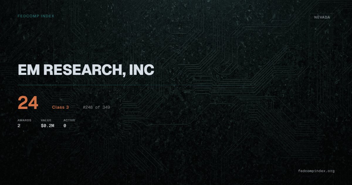 EM RESEARCH, INC holds position #248 among 349 Nevada federal contractors scored by the FedComp Index at 24. Contract records show $0.2M in federal awards over the five-year scoring window. All recorded awards come from Department of Defense. Last recorded award dates to 2023. Top competitors by award overlap include BLACKPOINT LLC and YARCOM INC.