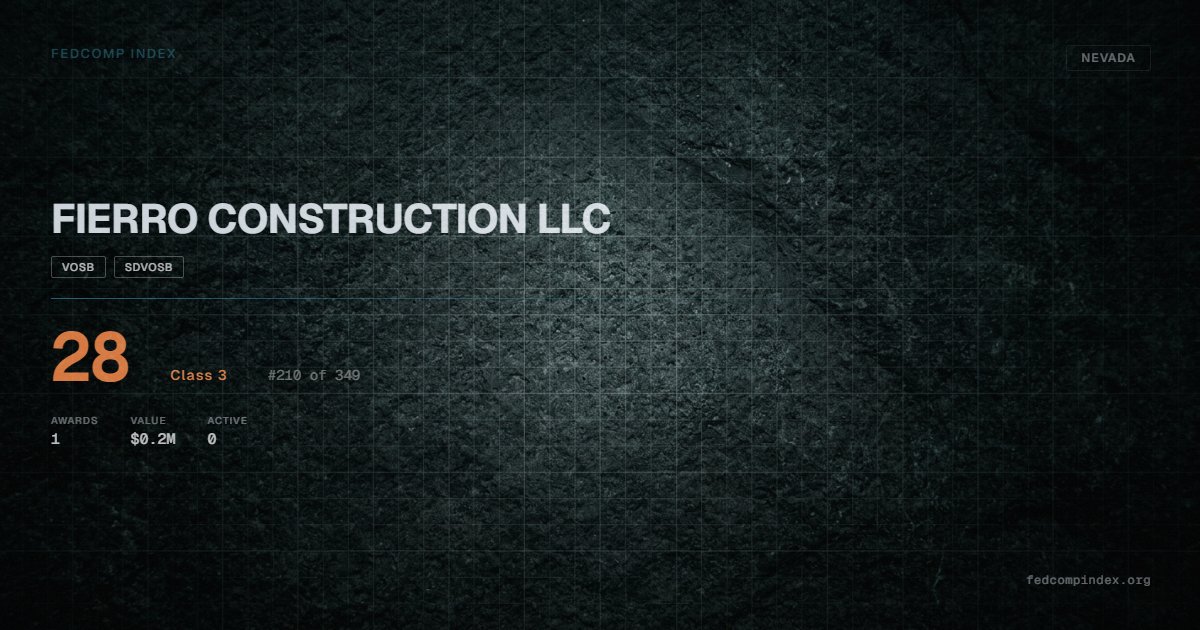FIERRO CONSTRUCTION LLC holds position #210 among 349 Nevada federal contractors scored by the FedComp Index at 28. Contract records show $0.2M in federal awards over the five-year scoring window. All recorded awards come from Department of Veterans Affairs. Certified as VOSB and SDVOSB through the SBA. Most recent award recorded in January 2026. Top competitors by award overlap include AJNC INDUSTRIES LLC and INNOVATIVE COMMUNICATIONS SYSTEMS, LLC.