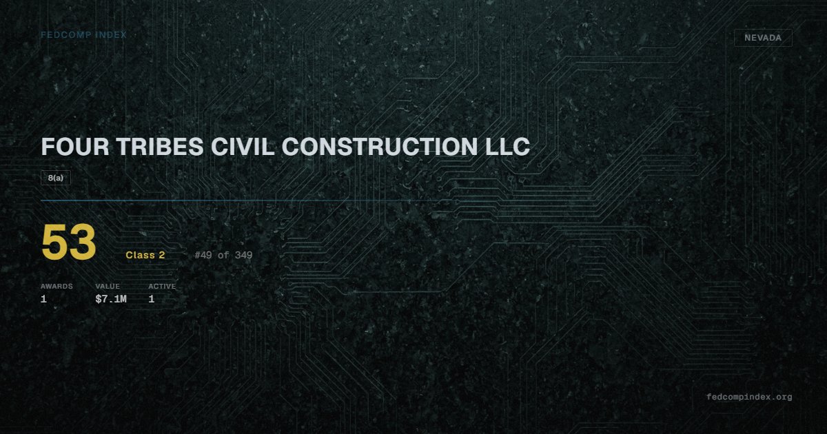 FOUR TRIBES CIVIL CONSTRUCTION LLC is a Nevada-based federal contractor ranked #49 of 349 with a FedComp Index score of 53. Award records total $7.1M from 1 federal contracts over five years. All recorded awards come from Department of Defense. Carries an active 8(a) certification. One contract currently active. Last award dated July 2025. Top competitors by award overlap include JAMES F THOMSON JR and CORE CONTRACTING GROUP.