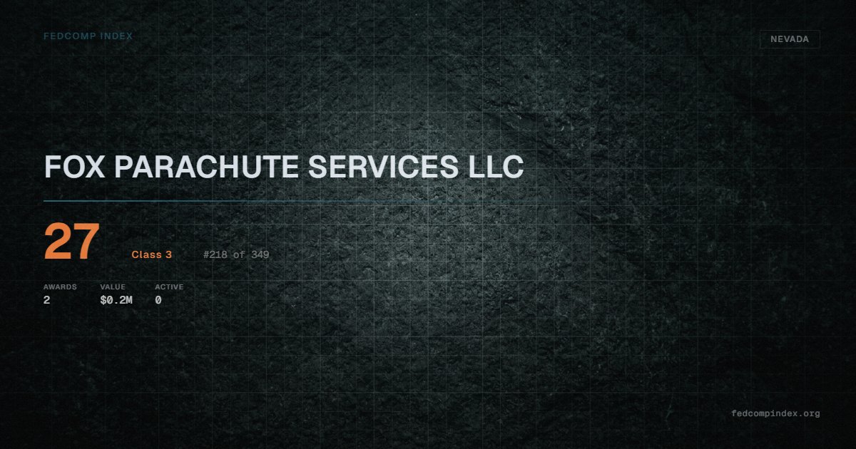 FOX PARACHUTE SERVICES LLC holds position #218 among 349 Nevada federal contractors scored by the FedComp Index at 27. Contract records show $0.2M in federal awards over the five-year scoring window. All recorded awards come from Department of Defense. Last recorded award dates to 2024. Closest competitor by award overlap is BIGHORN SOLUTIONS LLC.