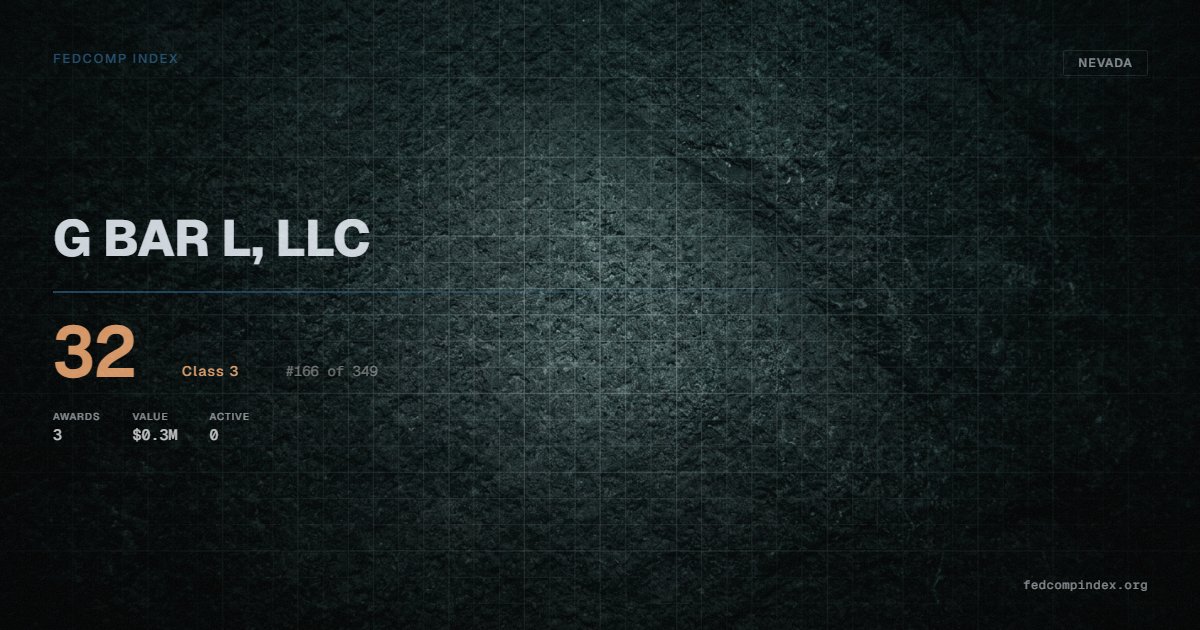 G BAR L, LLC holds position #166 among 349 Nevada federal contractors scored by the FedComp Index at 32. Contract records show $0.3M in federal awards over the five-year scoring window. Awards span Department of Agriculture and Department of the Interior. Last award dated August 2025. Top competitors by award overlap include CHRISTOPHER MICHAEL KAAMASEE and RANGELANDS RESTORATION SERVICES LLC.