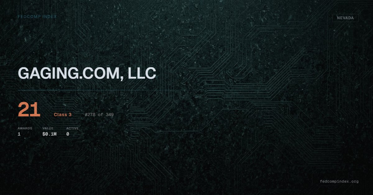 GAGING.COM, LLC holds position #278 among 349 Nevada federal contractors scored by the FedComp Index at 21. Contract records show $0.1M in federal awards over the five-year scoring window. All recorded awards come from Department of Defense. Last recorded award dates to 2023.