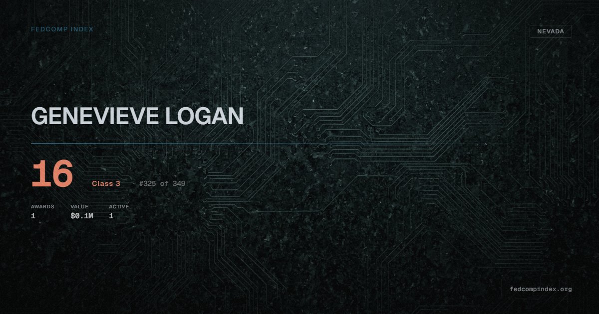 GENEVIEVE LOGAN holds position #325 among 349 Nevada federal contractors scored by the FedComp Index at 16. Contract records show $0.1M in federal awards over the five-year scoring window. All recorded awards come from Department of the Interior. One contract currently active. Last recorded award dates to 2022. Top competitors by award overlap include TWO BEES CLEANING SERVICE and DETAIL CLEANING SERVICE INC.