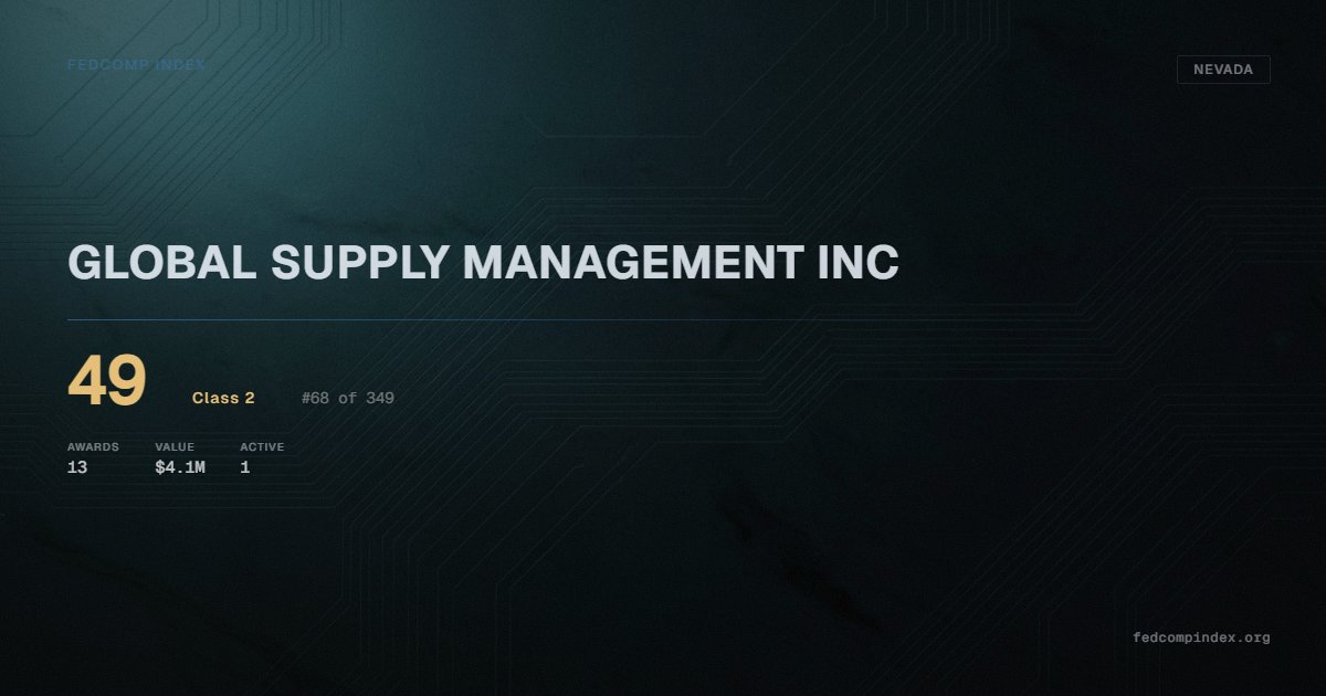 GLOBAL SUPPLY MANAGEMENT INC is a Nevada-based federal contractor ranked #68 of 349 with a FedComp Index score of 49. Award records total $4.1M from 13 federal contracts over five years. Contract history spans 4 federal agencies including Department of Defense. One contract currently active. Last award dated September 2025. Top competitors by award overlap include JP GENERAL INC and JTM ENTERPRISES LLC.