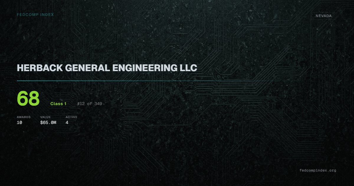 HERBACK GENERAL ENGINEERING LLC is a Class 1 Nevada federal contractor with a FedComp Index score of 68, ranked #12 of 349. Over five years, HERBACK GENERAL ENGINEERING LLC has secured $65.0M in federal contract value from 10 awards. Contracts come from Department of Agriculture, Department of Transportation, and Department of the Interior. 4 contracts currently active. Most recent award recorded in March 2026. Top competitors by award overlap include PUYENPA CONSTRUCTION, LLC and BJD SERVICES LLC.