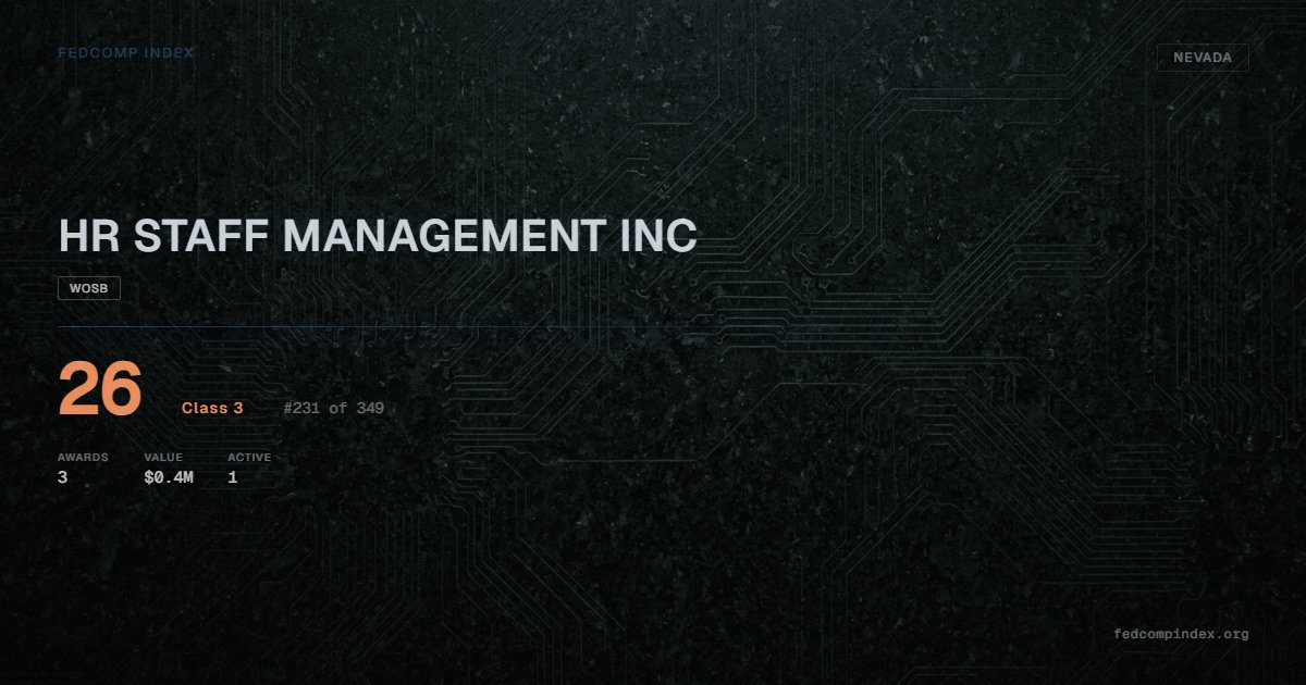 HR STAFF MANAGEMENT INC holds position #231 among 349 Nevada federal contractors scored by the FedComp Index at 26. Contract records show $0.4M in federal awards over the five-year scoring window. Awards span Department of Defense and Department of Justice. Carries an active WOSB certification. One contract currently active. Last recorded award dates to 2023. Top competitors by award overlap include GLOBAL NETWAVE LLC and TWIN OTTER INTERNATIONAL LTD.