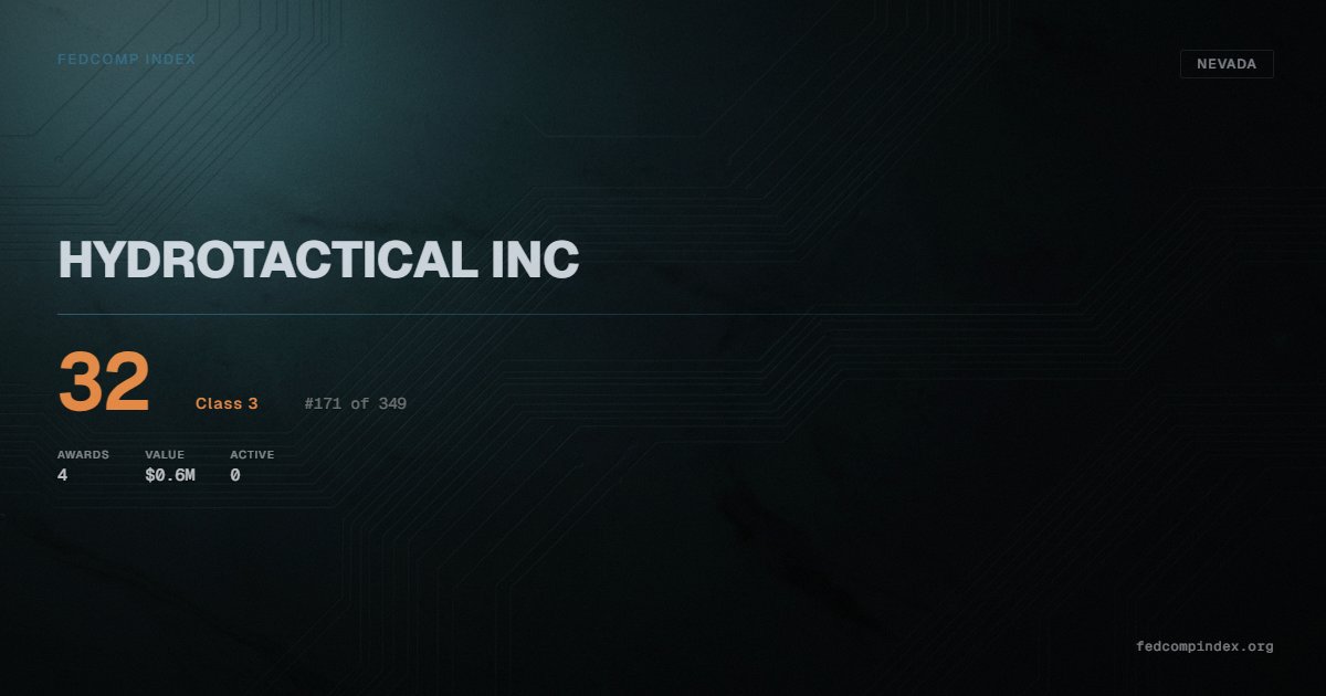 HYDROTACTICAL INC holds position #171 among 349 Nevada federal contractors scored by the FedComp Index at 32. Contract records show $0.6M in federal awards over the five-year scoring window. All recorded awards come from Department of Agriculture. Last recorded award dates to 2024. Top competitors by award overlap include HENDON, DOUGLAS H and ROADWAY COMPANY.