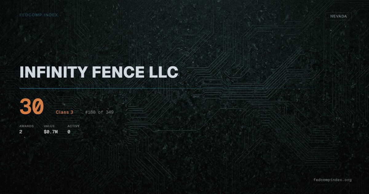 INFINITY FENCE LLC holds position #188 among 349 Nevada federal contractors scored by the FedComp Index at 30. Contract records show $0.7M in federal awards over the five-year scoring window. All recorded awards come from Department of the Interior. Last recorded award dates to 2023. Top competitors by award overlap include DWIRE CLEAVE and MOUNTAIN STATES RESTORATION, LLC.