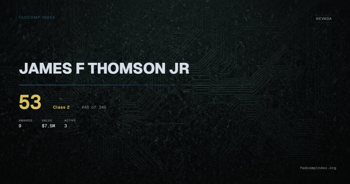 JAMES F THOMSON JR is a Nevada-based federal contractor ranked #48 of 349 with a FedComp Index score of 53. Award records total $7.5M from 9 federal contracts over five years. Awards span Department of the Interior and General Services Administration. 3 contracts currently active. Last award dated September 2025. Top competitors by award overlap include SIMERSON CONSTRUCTION LLC and S&B CHRIST CONSULTING, LLC.