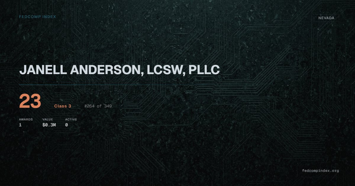 JANELL ANDERSON, LCSW, PLLC holds position #264 among 349 Nevada federal contractors scored by the FedComp Index at 23. Contract records show $0.3M in federal awards over the five-year scoring window. All recorded awards come from Department of Veterans Affairs. Last recorded award dates to 2022. Closest competitor by award overlap is EVERGREEN COUNSELING.