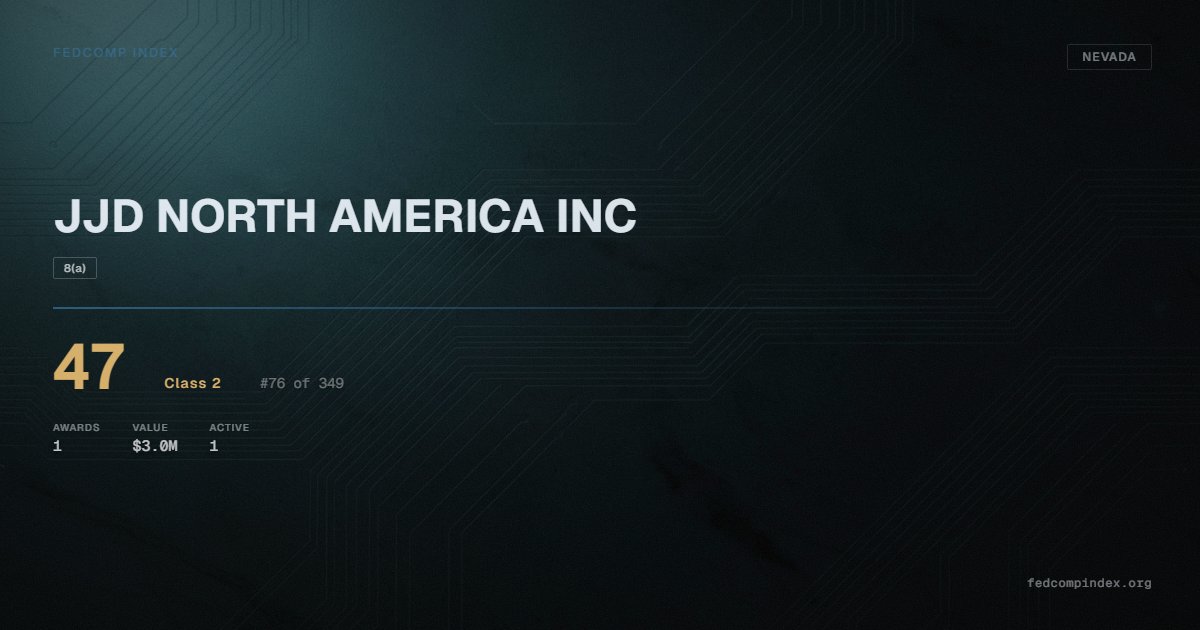 JJD NORTH AMERICA INC is a Nevada-based federal contractor ranked #76 of 349 with a FedComp Index score of 47. Award records total $3.0M from 1 federal contracts over five years. All recorded awards come from Department of Defense. Carries an active 8(a) certification. One contract currently active. Last award dated September 2025. Top competitors by award overlap include BROADBENT & ASSOCIATES, INC. and MOUNTAIN STATES RESTORATION, LLC.