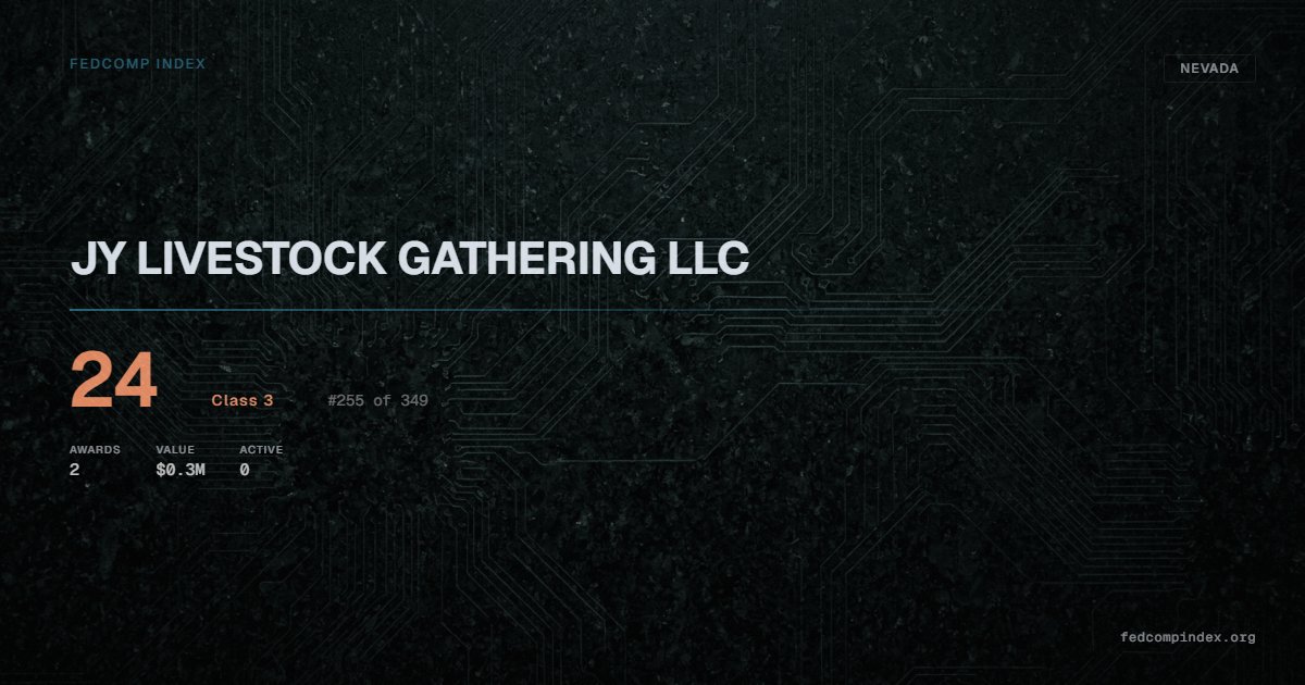 JY LIVESTOCK GATHERING LLC holds position #255 among 349 Nevada federal contractors scored by the FedComp Index at 24. Contract records show $0.3M in federal awards over the five-year scoring window. Awards span Department of Agriculture and Department of the Interior. Last recorded award dates to 2022.